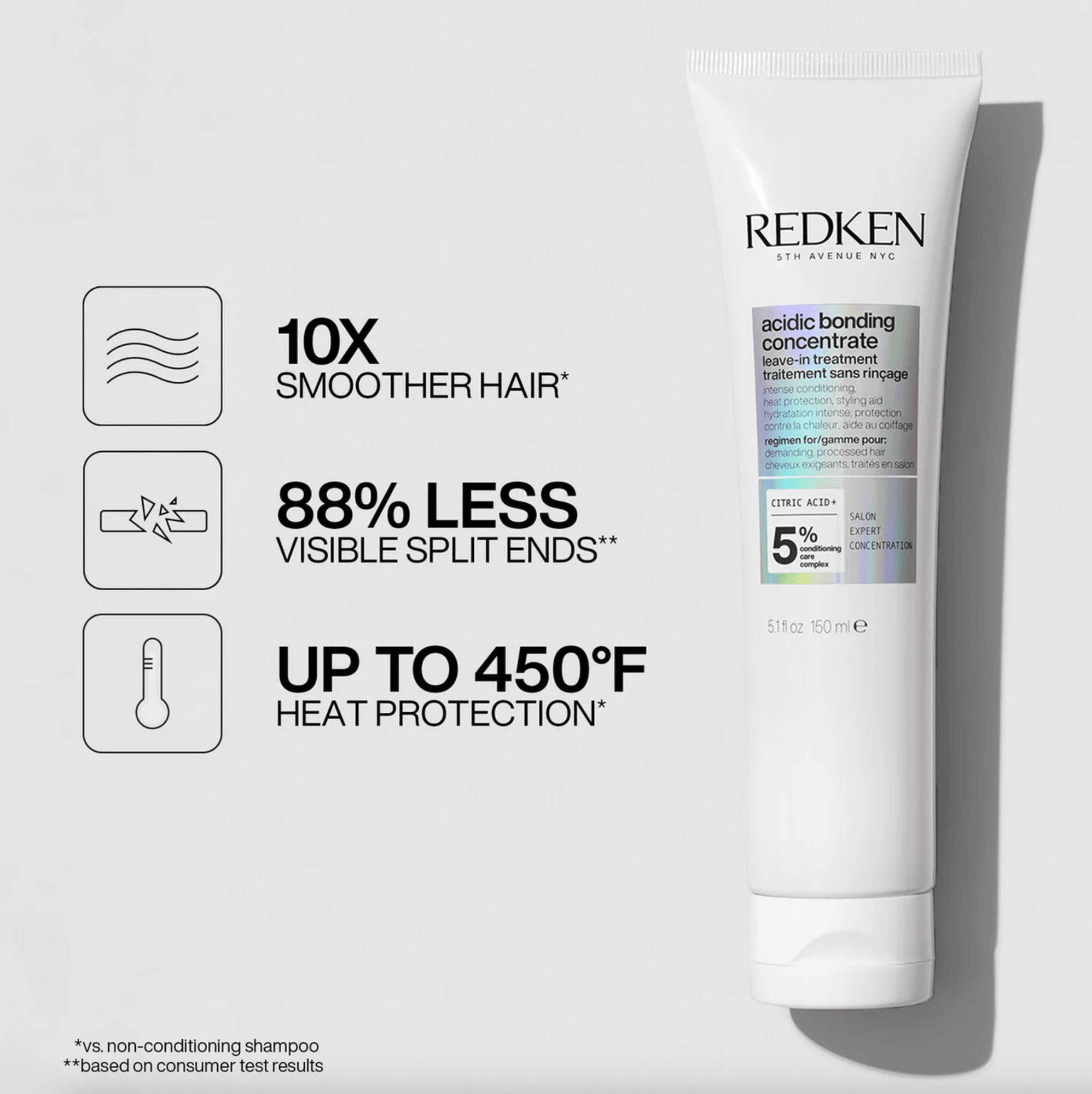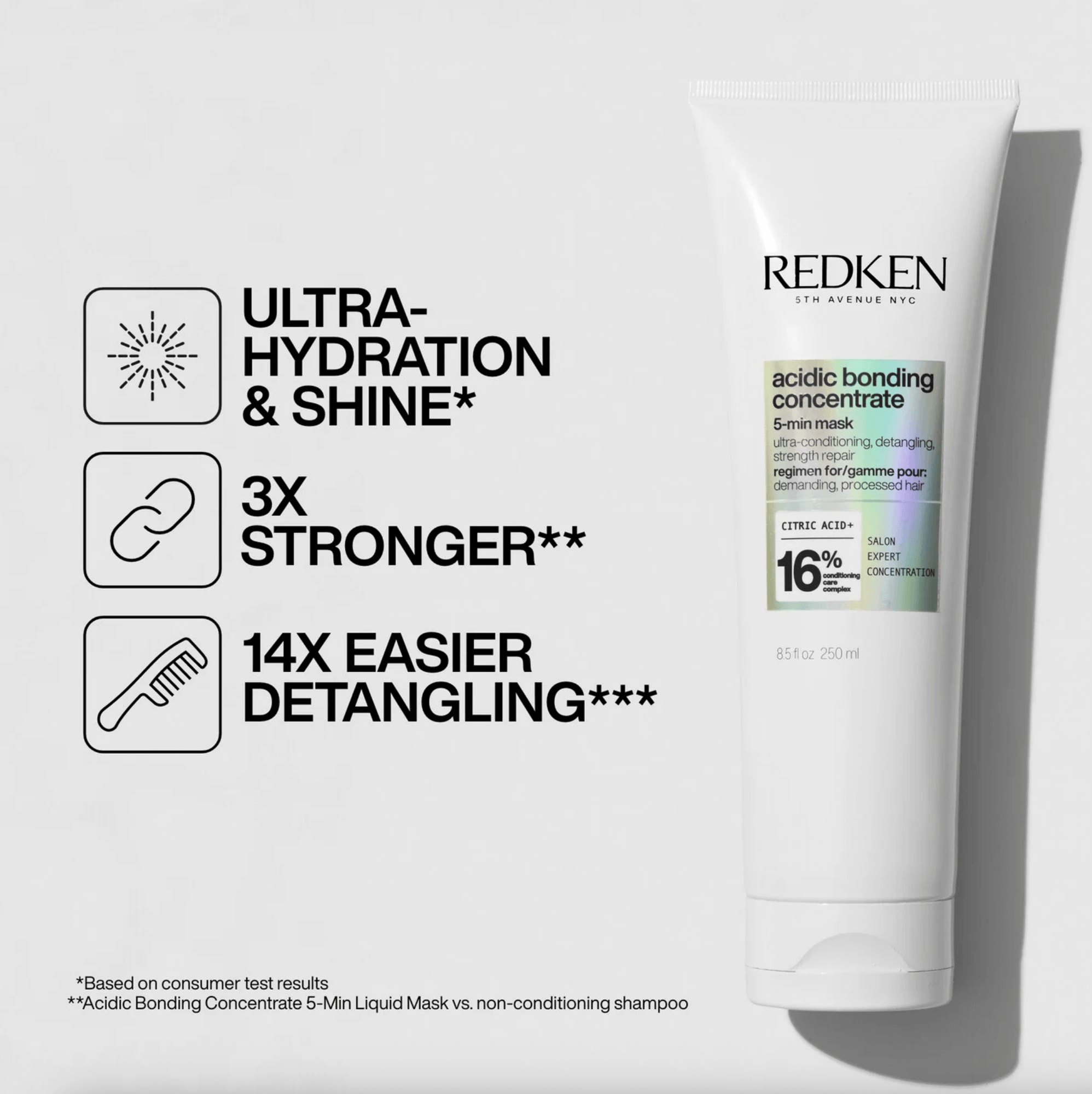 The first step in Redken's Acidic Bonding Concentrate regimen, the Intensive Pre-Shampoo Treatment provides strength repair in 1 use*. With Redken's highest level of Citric Acid + Bonding Care Complex, this rinse out treatment provides 14x smoother hair* and 63% less breakage*. The concentrated intensive treatment formula reinforces weakened bonds and prepares hair for the full benefits of the Acidic Bonding Concentrate Shampoo and Conditioner.